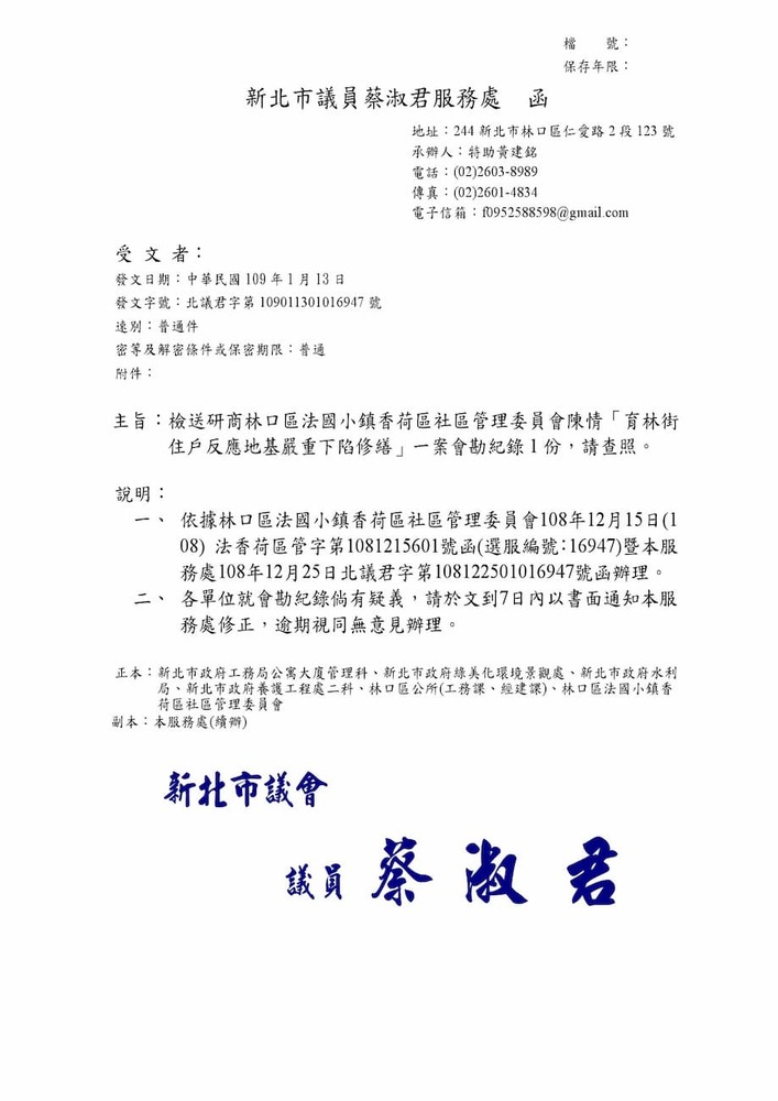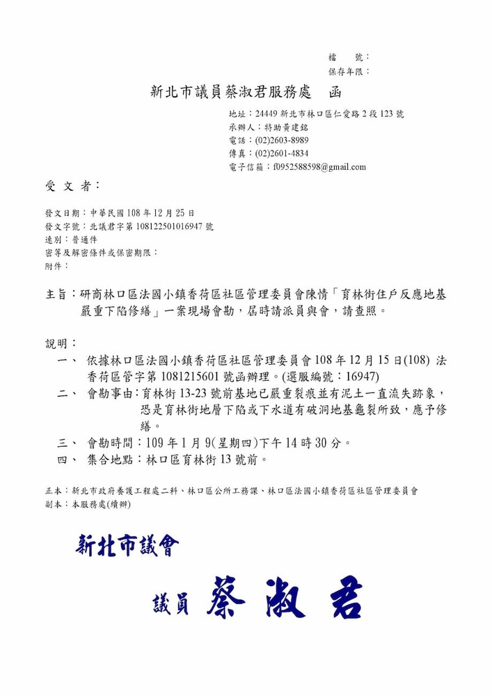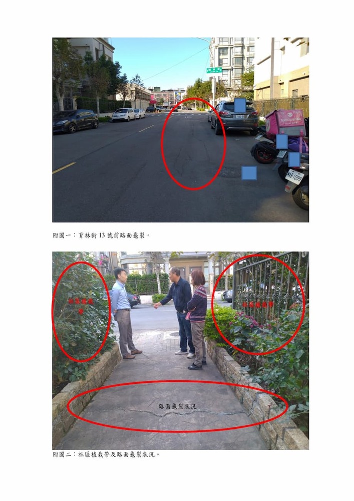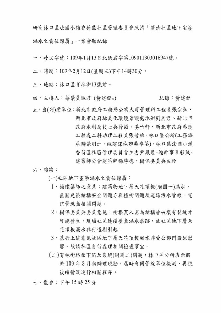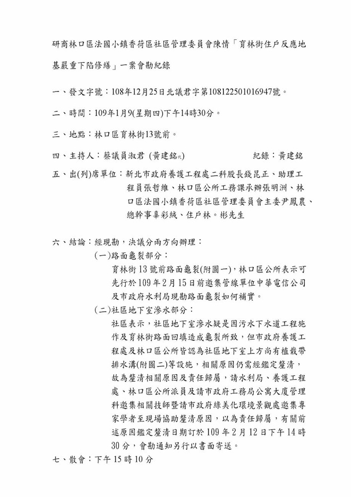 研商林口區法國小鎮香荷區社區管理委員會陳情「育林街住戶反應地基嚴重下陷修繕」一案會勘。(16947)結案