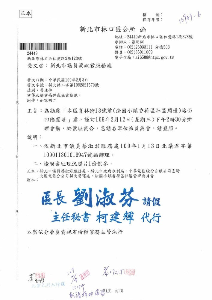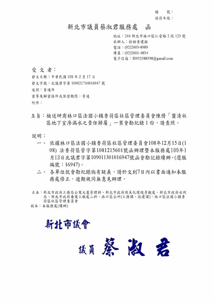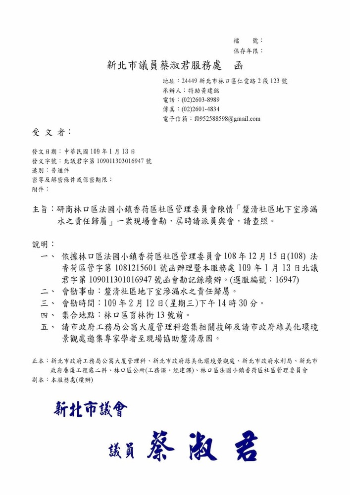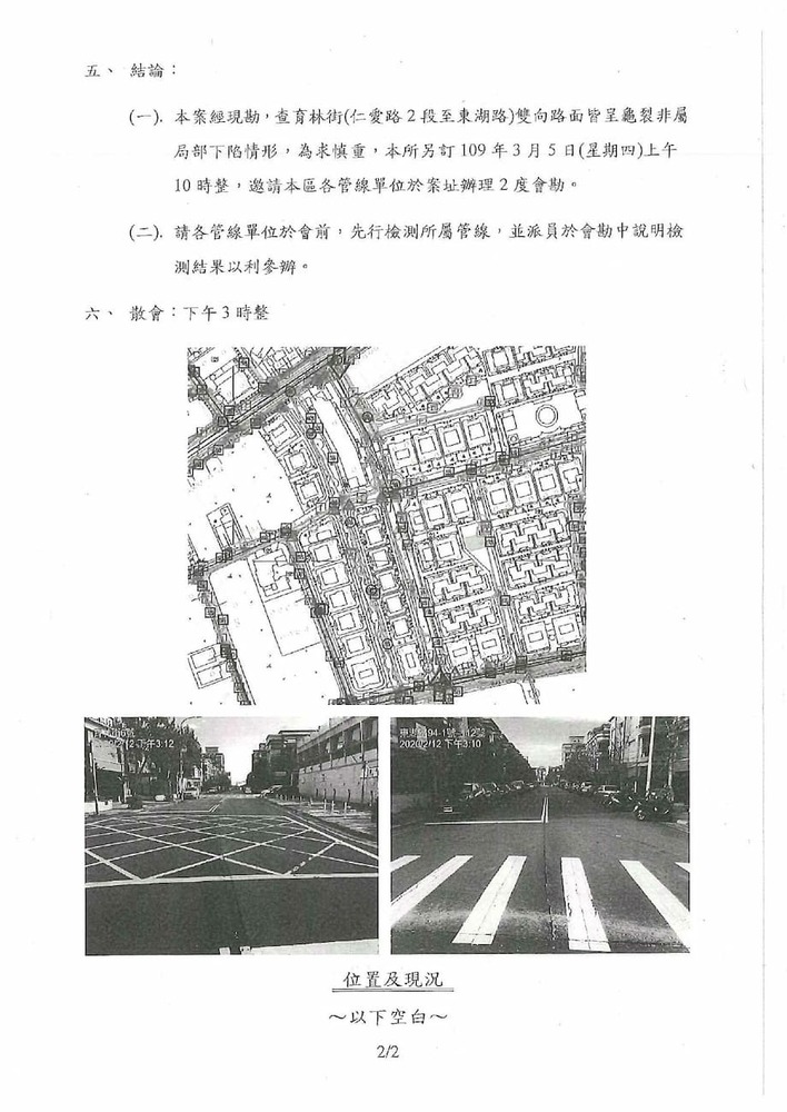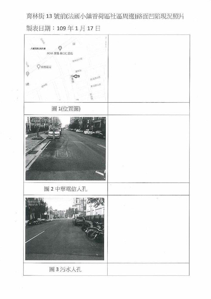 研商林口區法國小鎮香荷區社區管理委員會陳情「育林街住戶反應地基嚴重下陷修繕」一案會勘。(16947)結案