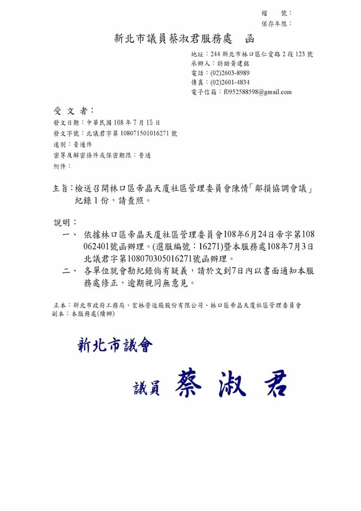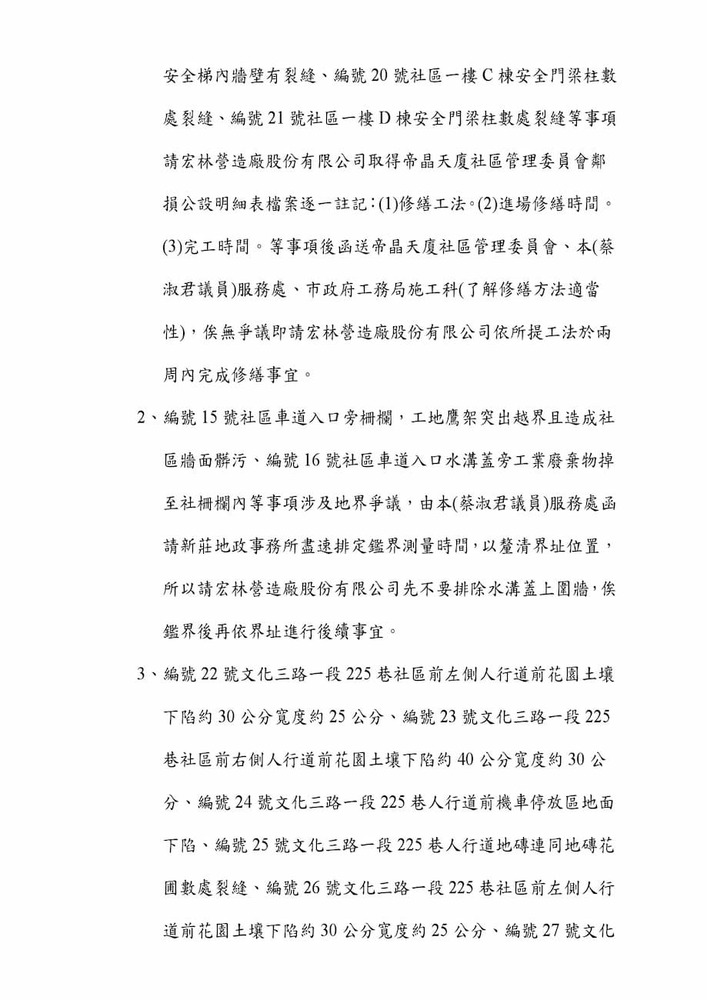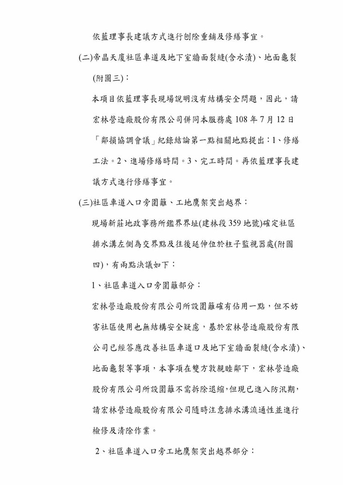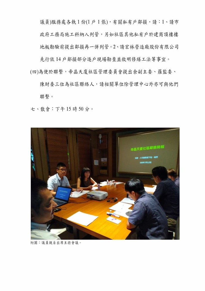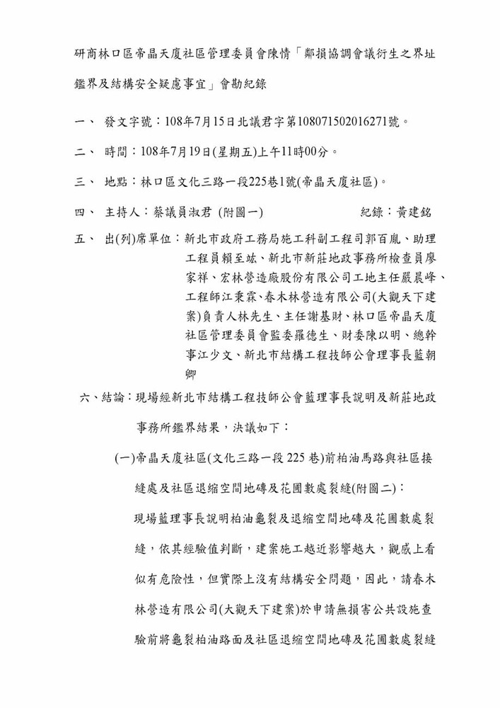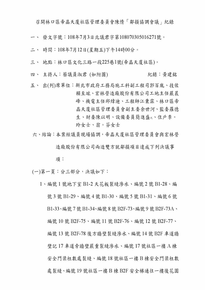 研商林口區帝晶天廈社區管理委員會陳情「鄰損協調會議」。(16271)結案