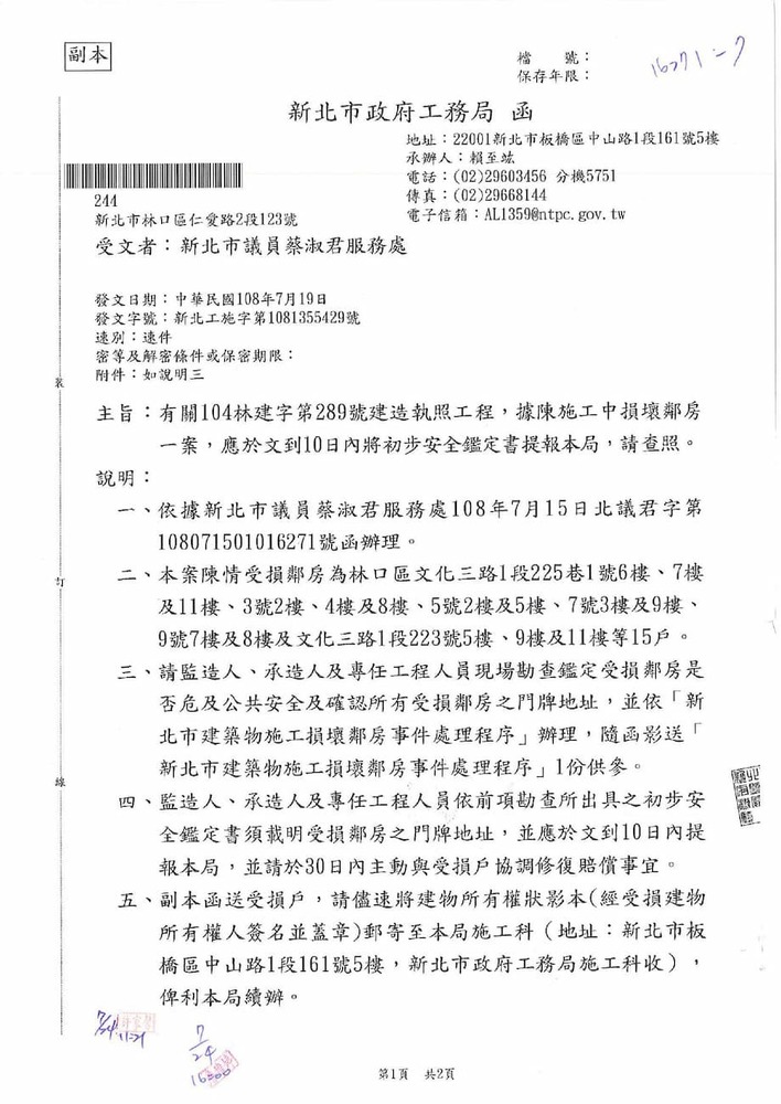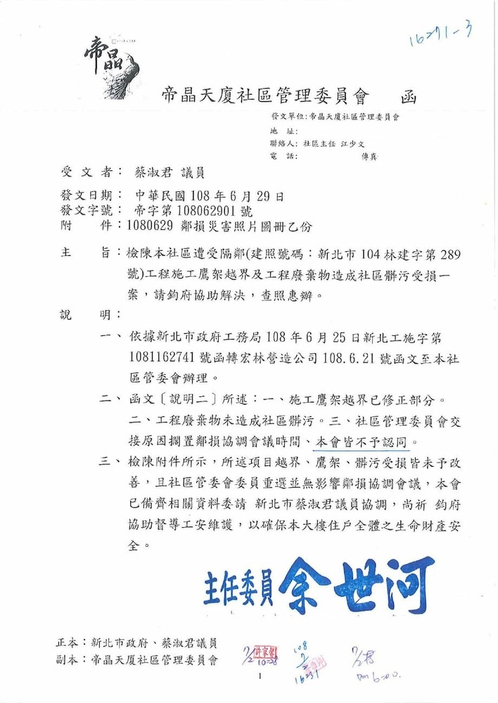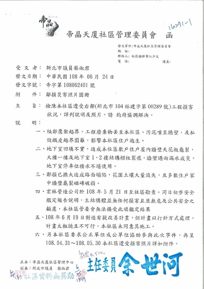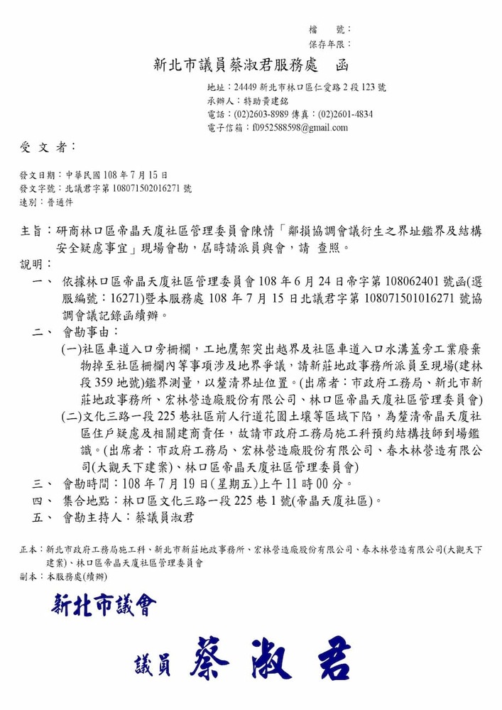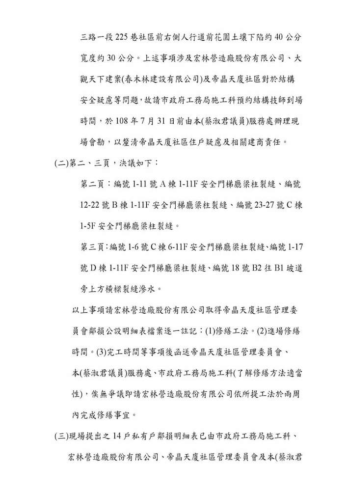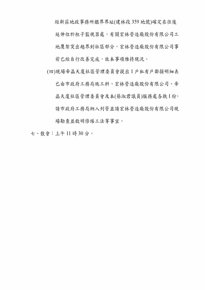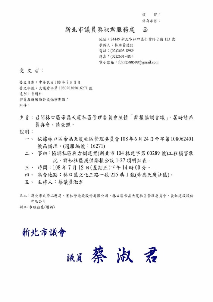 研商林口區帝晶天廈社區管理委員會陳情「鄰損協調會議」。(16271)結案