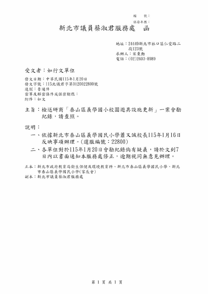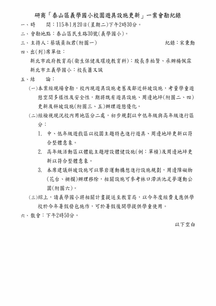 檢送研商「泰山區義學國小校園遊具設施更新」一案會勘紀錄。(22800)