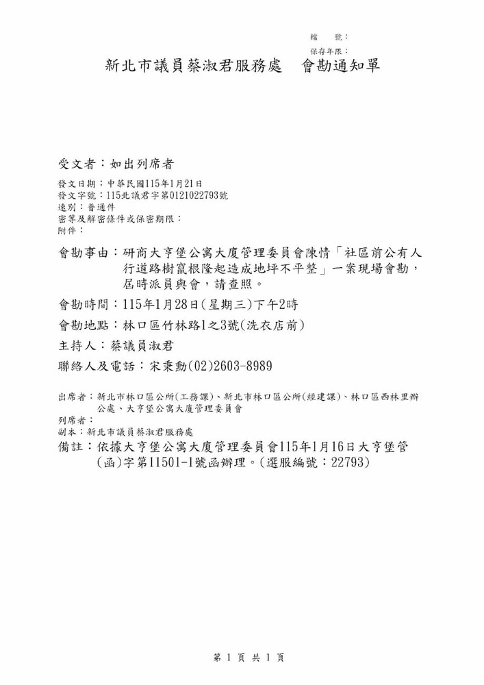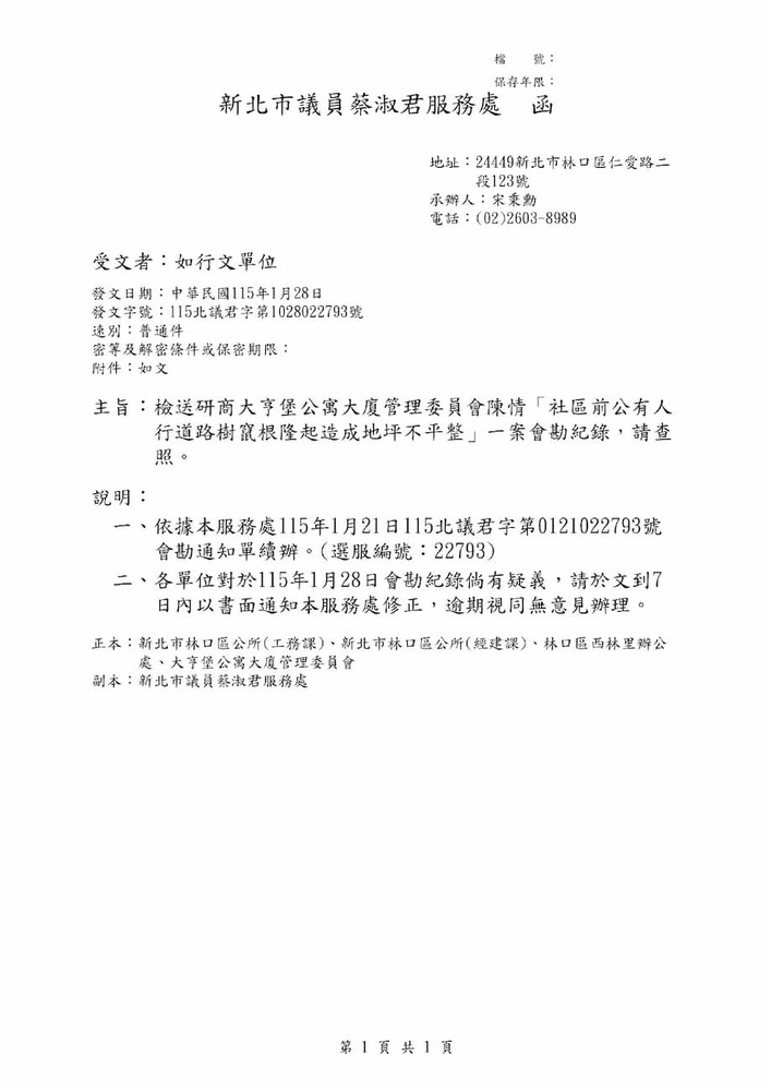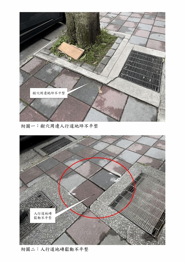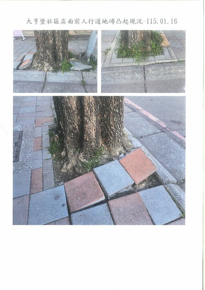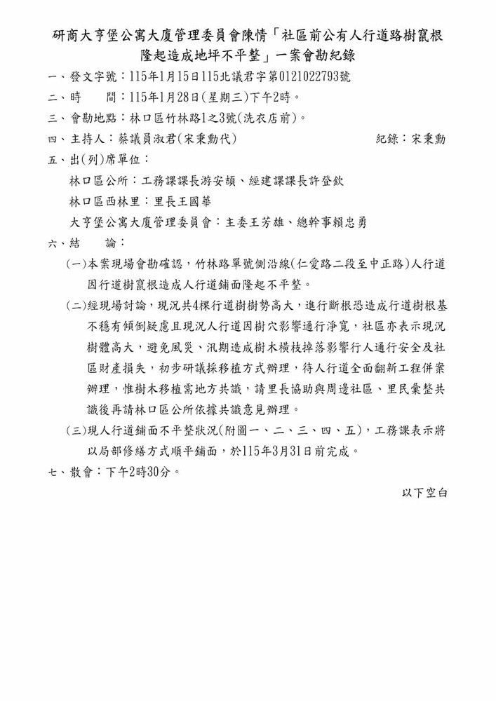 研商大亨堡公寓大廈管理委員會陳情「社區前公有人行道路樹竄根隆起造成地坪不平整」一案現場會勘。(22793)