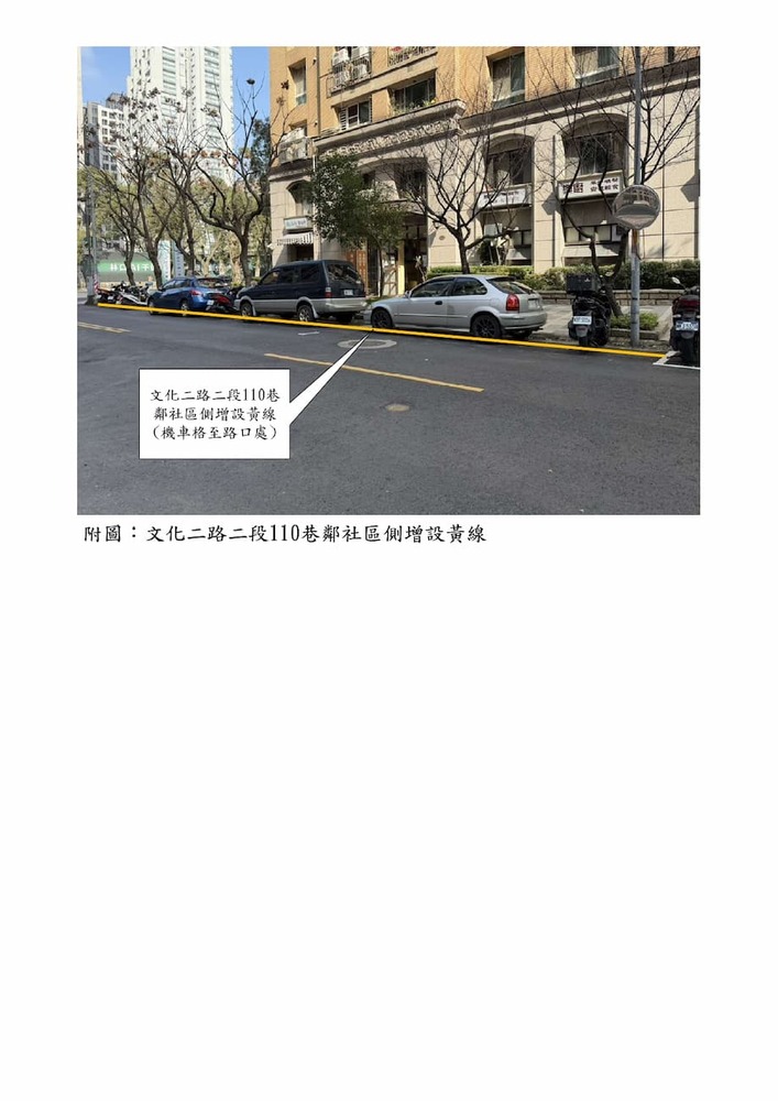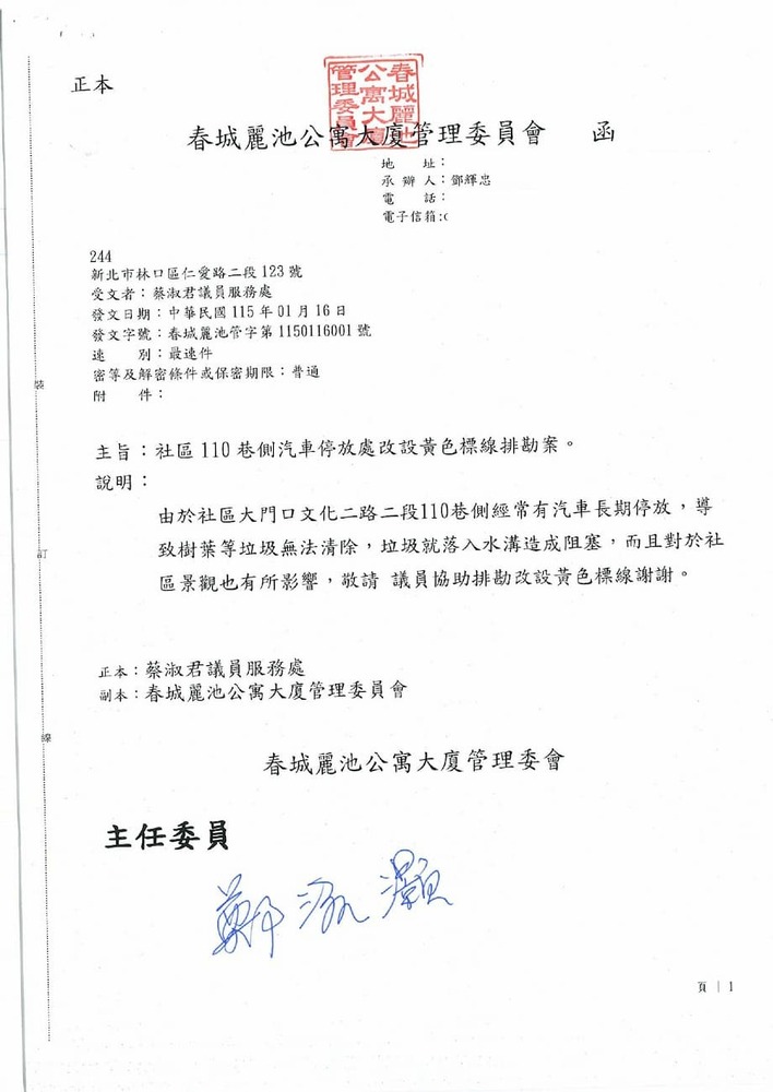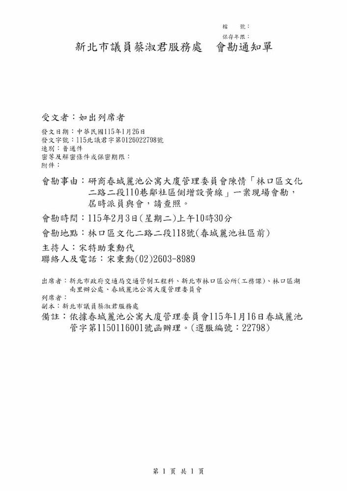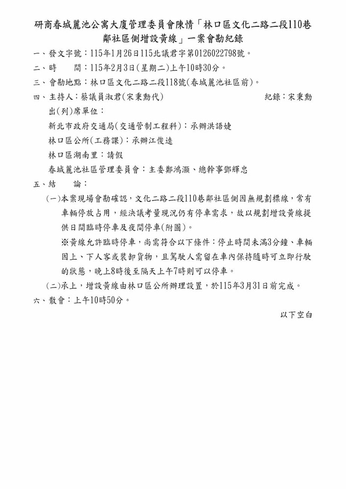 研商春城麗池公寓大廈管理委員會陳情「林口區文化二路二段110巷鄰社區側增設黃線」一案現場會勘。(22798)