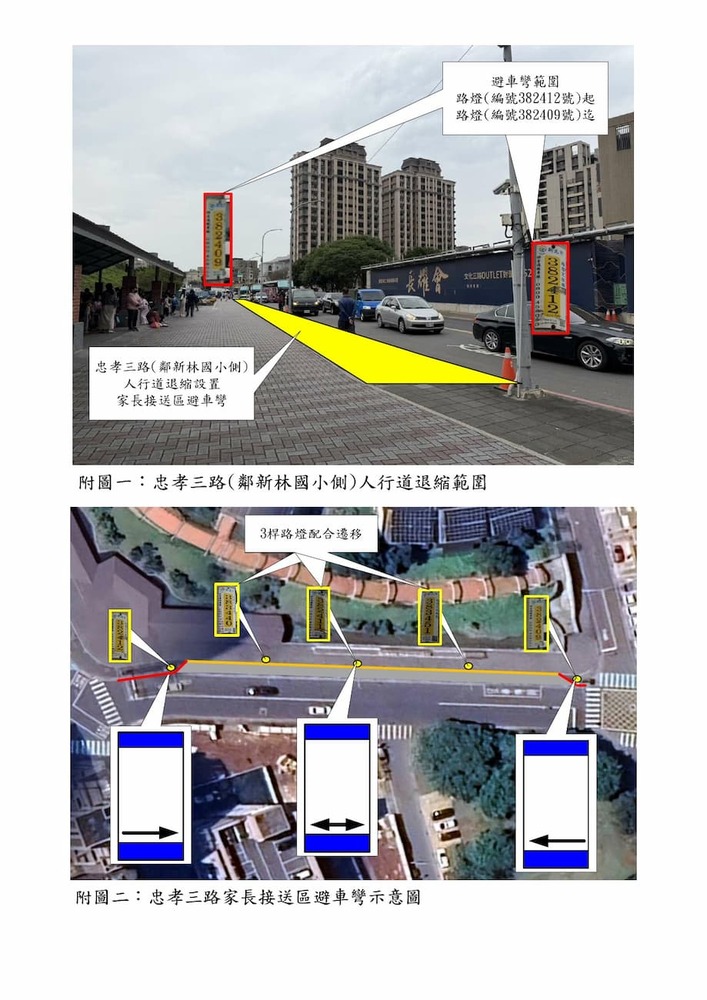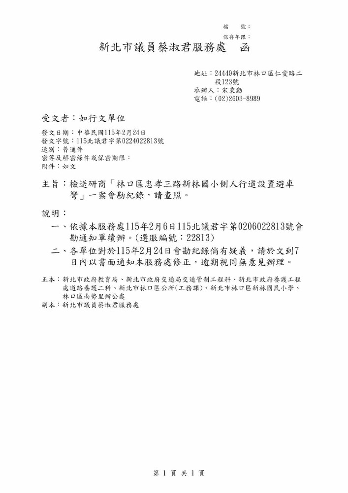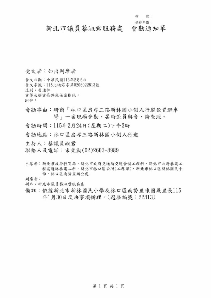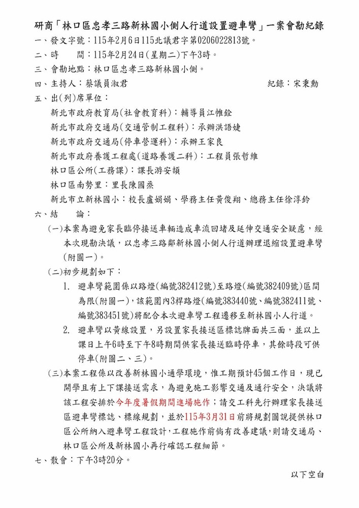 研商「林口區忠孝三路新林國小側人行道設置避車彎」一案現場會勘。(22813)
