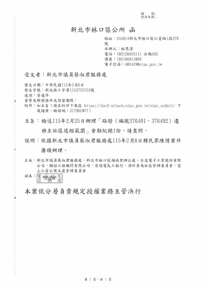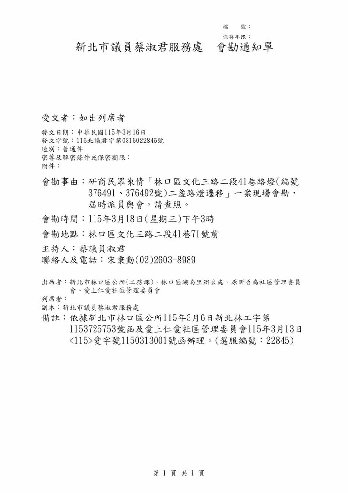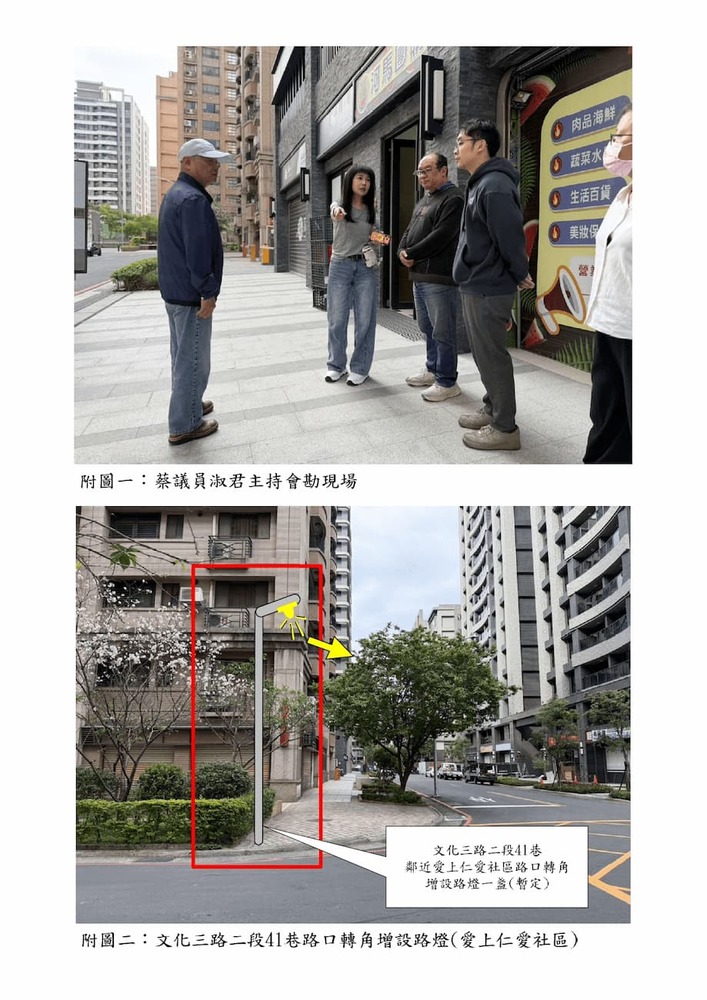 研商民眾陳情「林口區文化三路二段41巷路燈(編號376491、376492號)二盞路燈遷移」一案現場會勘(22845)