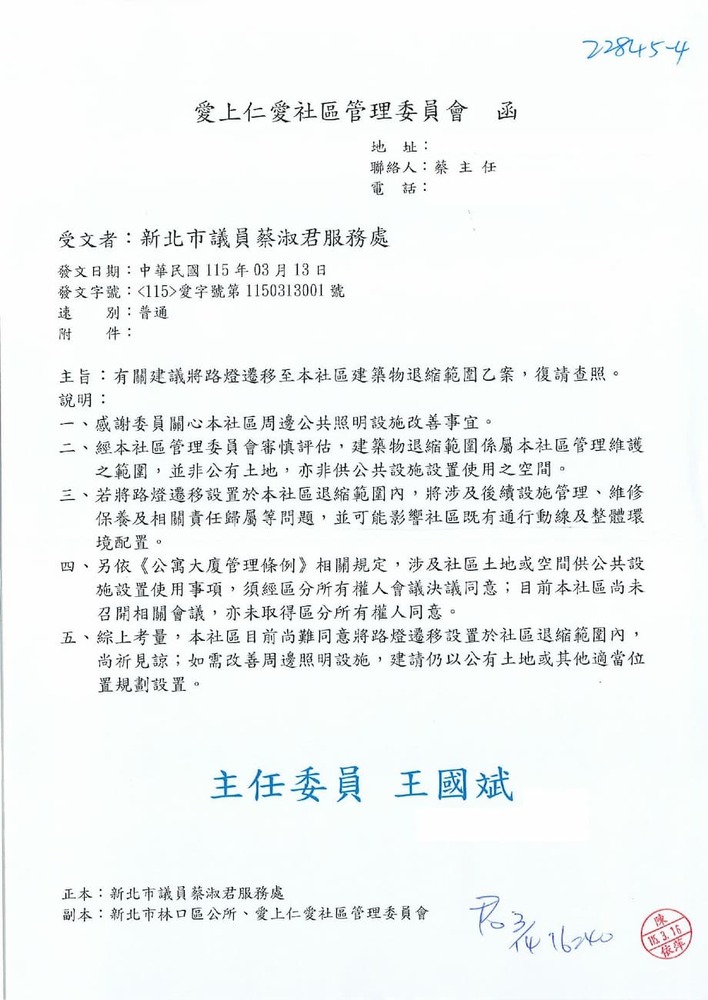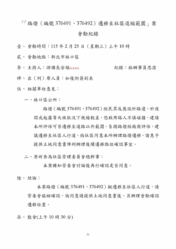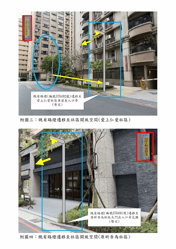 為研商本區「路燈(編號376491,376492)遷移至社區退縮範圍」案。(22845)