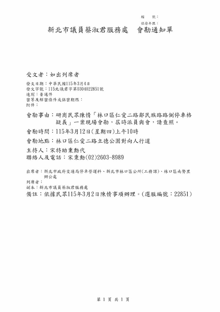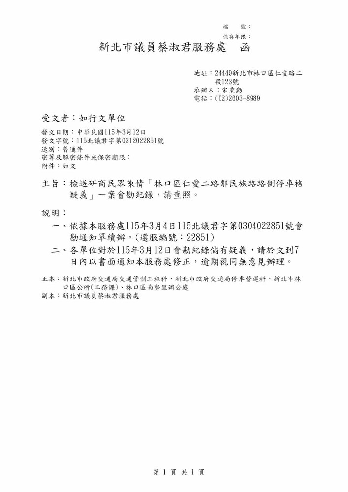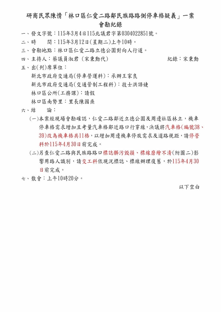 研商民眾陳情「林口區仁愛二路鄰民族路路側停車格疑義」一案現場會勘。(22851)