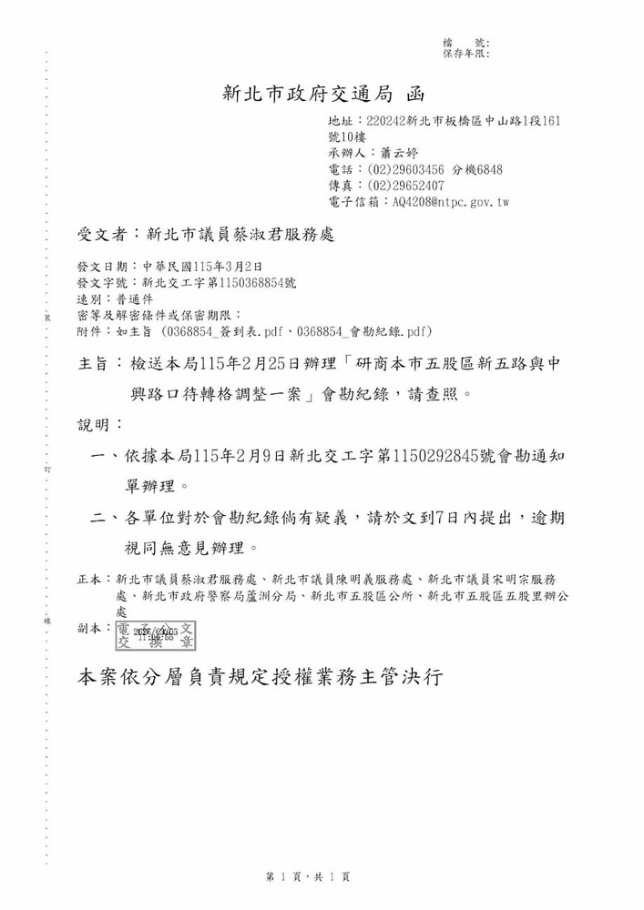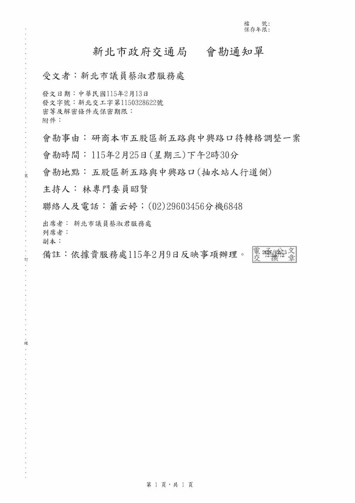 研商本市五股區新五路與中興路口待轉格調整一案。(22846)