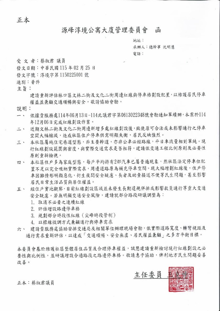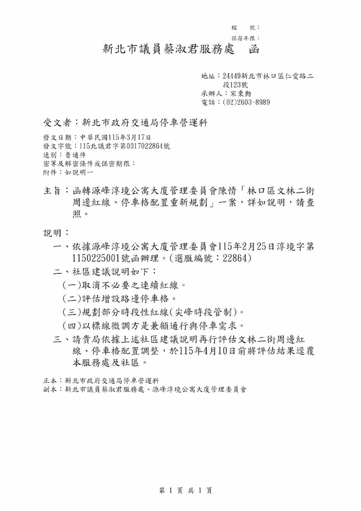 函轉源峰淳境公寓大廈管理委員會陳情「林口區文林二街周邊紅線、停車格配置重新規劃」一案,詳如說明,請查照。(22864)結案