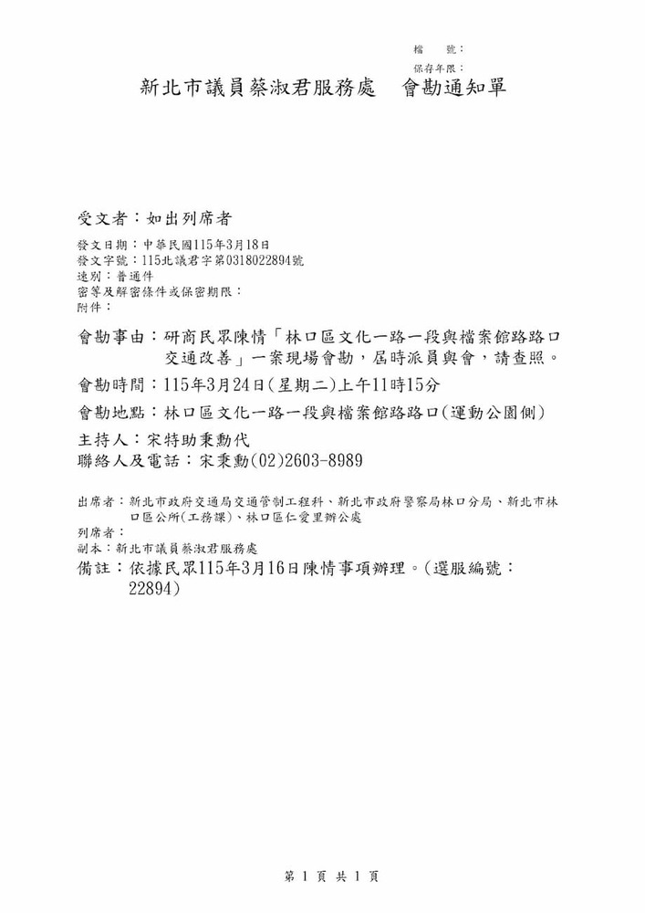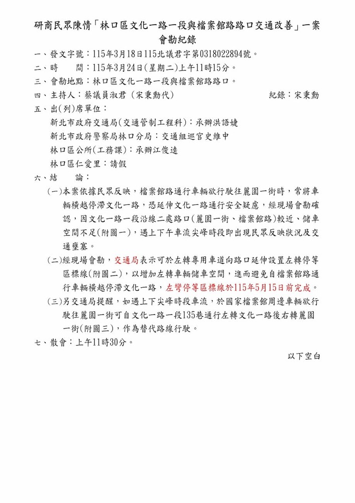 研商民眾陳情「林口區文化一路一段與檔案館路路口交通改善」一案現場會勘。(22894)