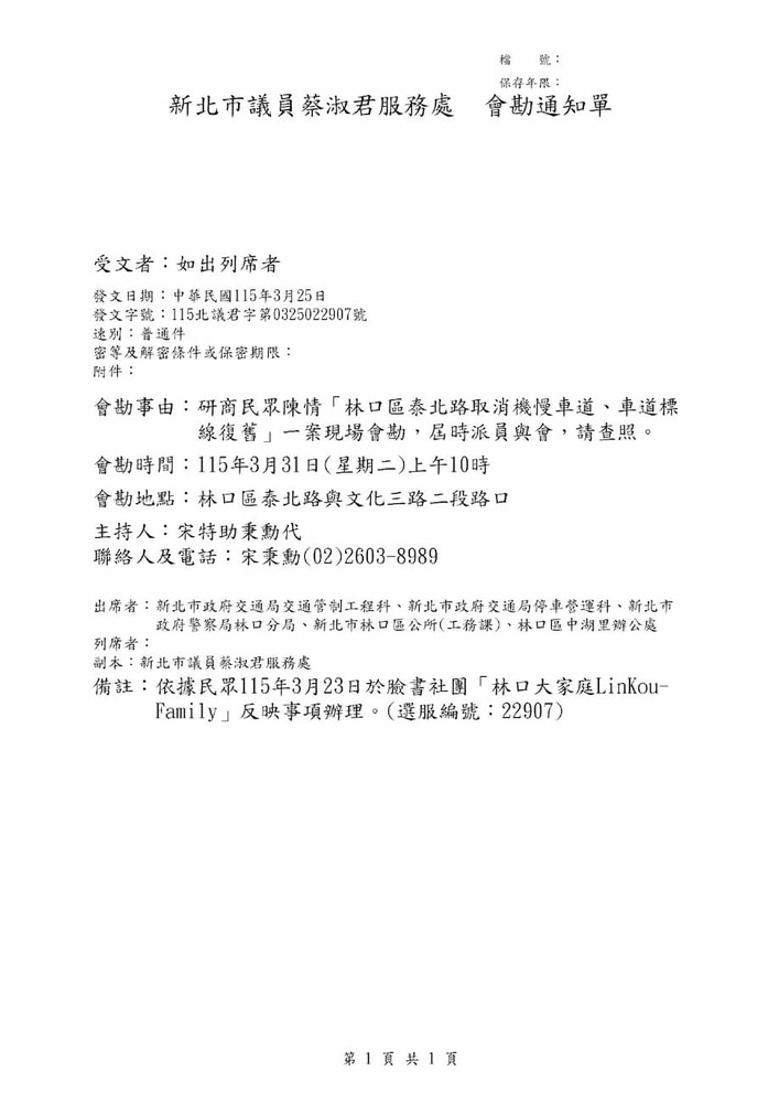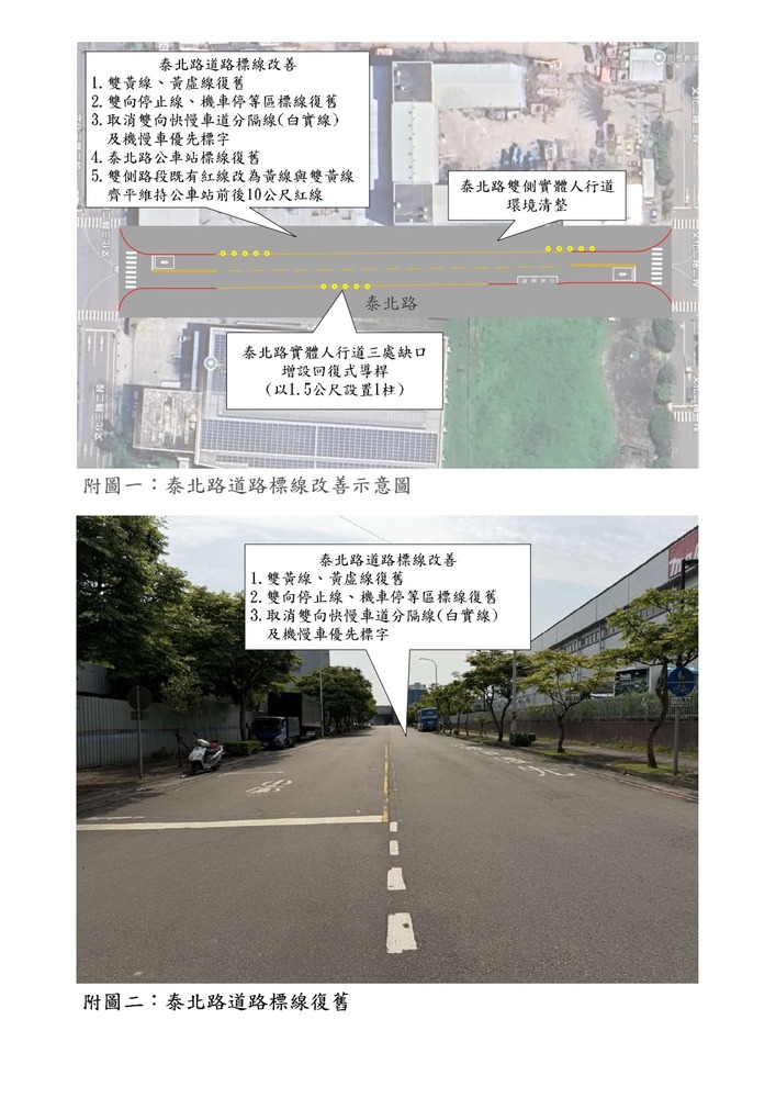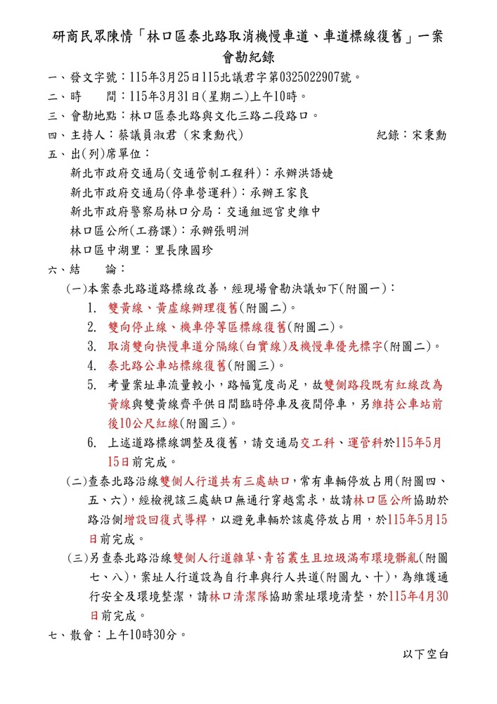 研商民眾陳情「林口區泰北路取消機慢車道、車道標線復舊」一案現場會勘。(22907)