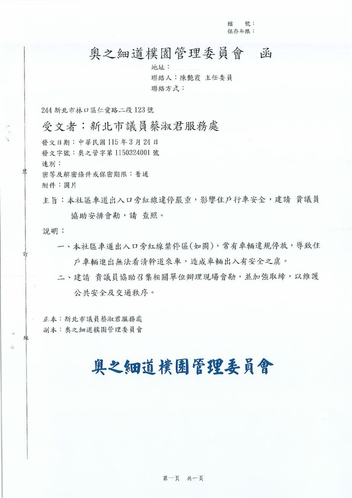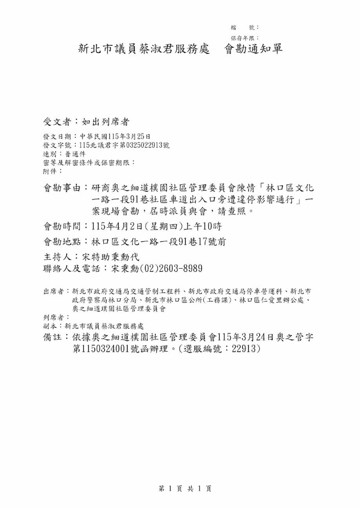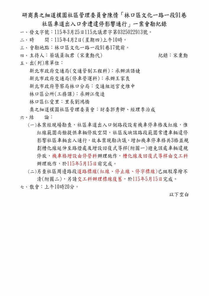 研商奧之細道樸園社區管理委員會陳情「林口區文化一路一段91巷社區車道出入口旁遭違停影響通行」一案現場會勘。(22913)