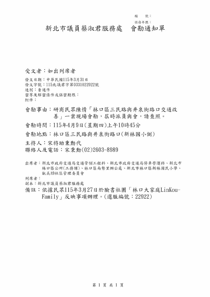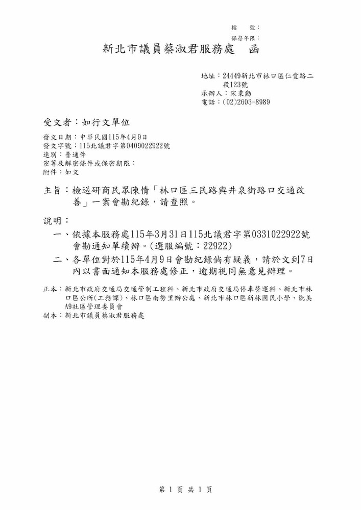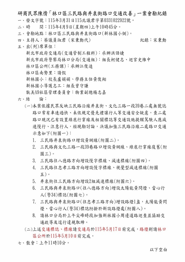 研商民眾陳情「林口區三民路與井泉街路口交通改善」一案現場會勘。(22922)