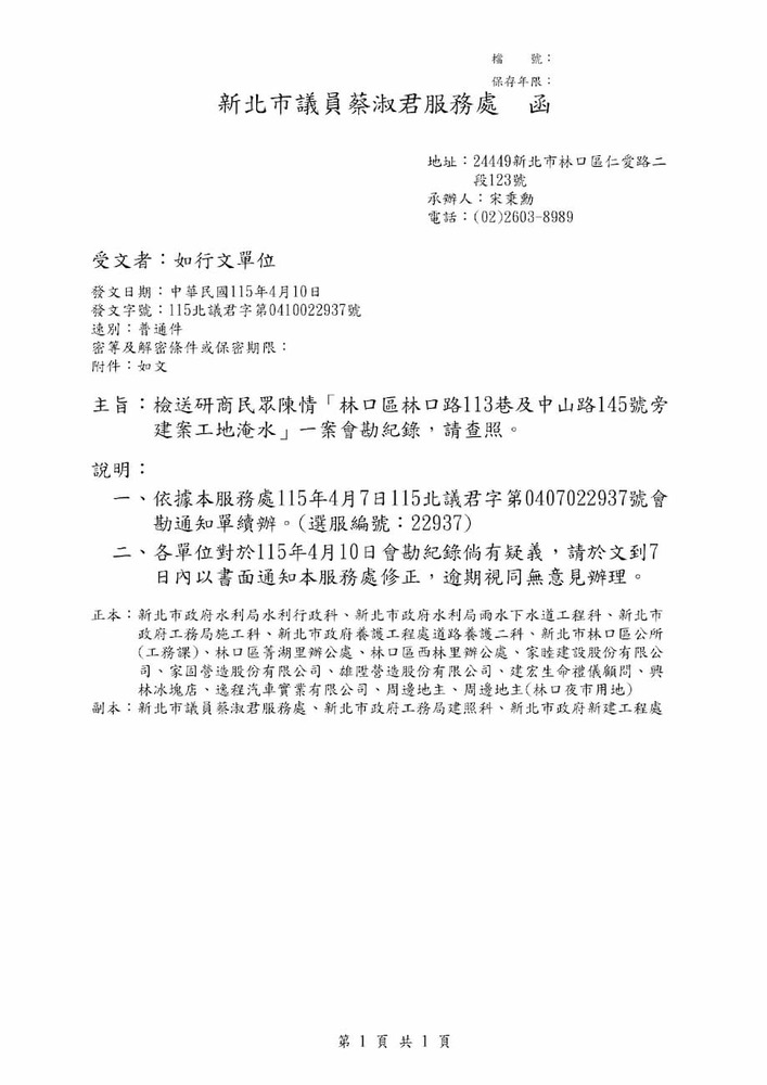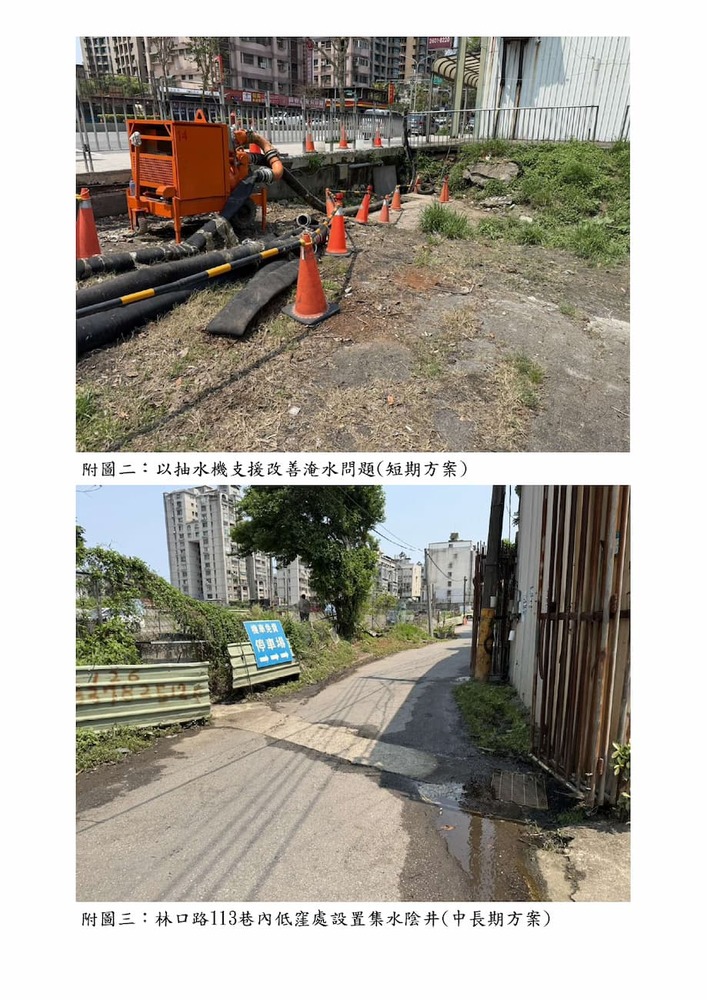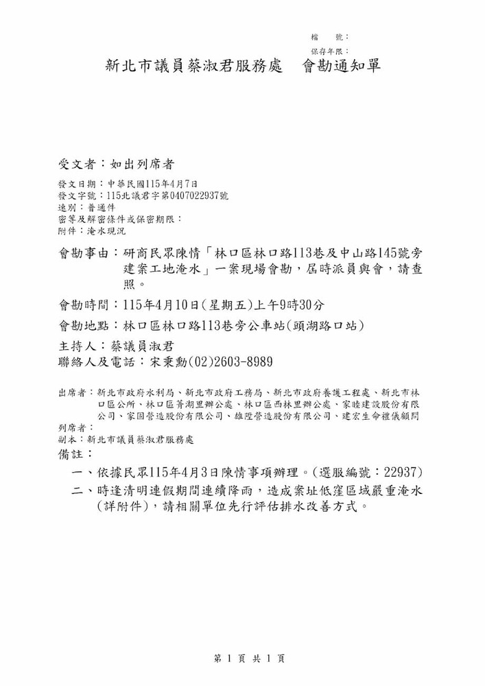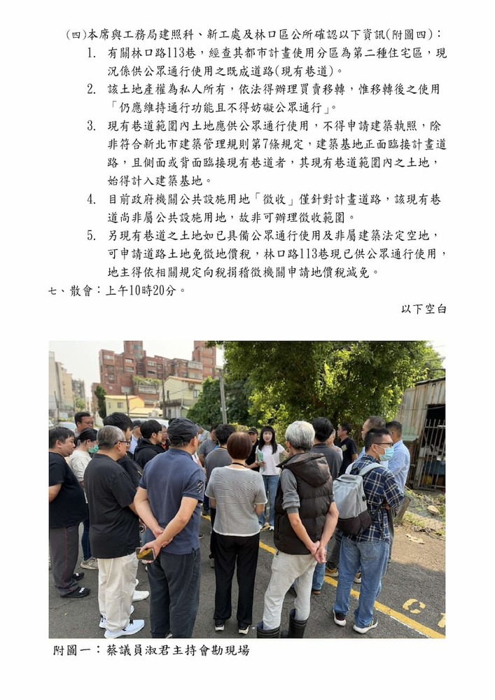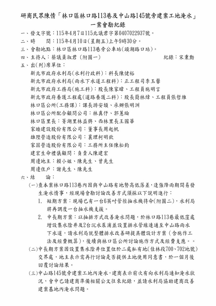研商民眾陳情「林口區林口路113巷及中山路145號旁建案工地淹水」一案現場會勘。(22937)