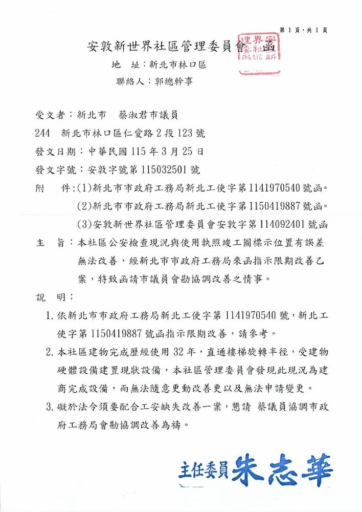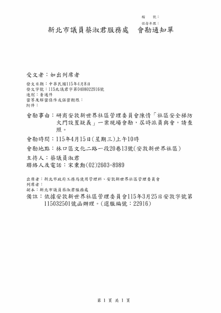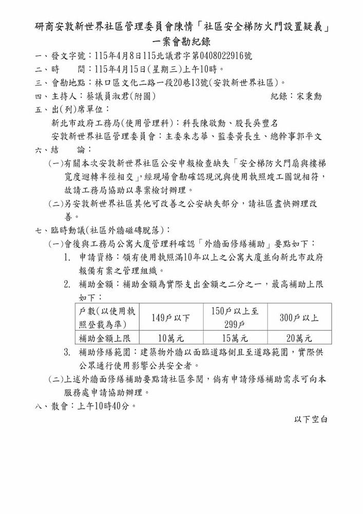 研商安敦新世界社區管理委員會陳情「社區安全梯防火門設置疑義」一案現場會勘。(22916)