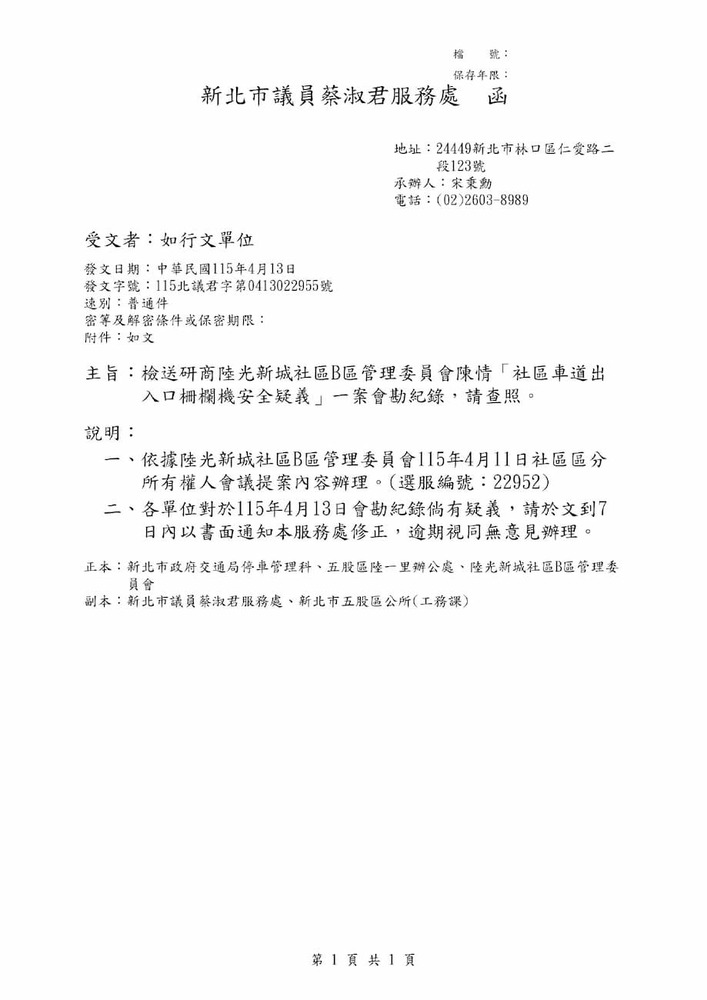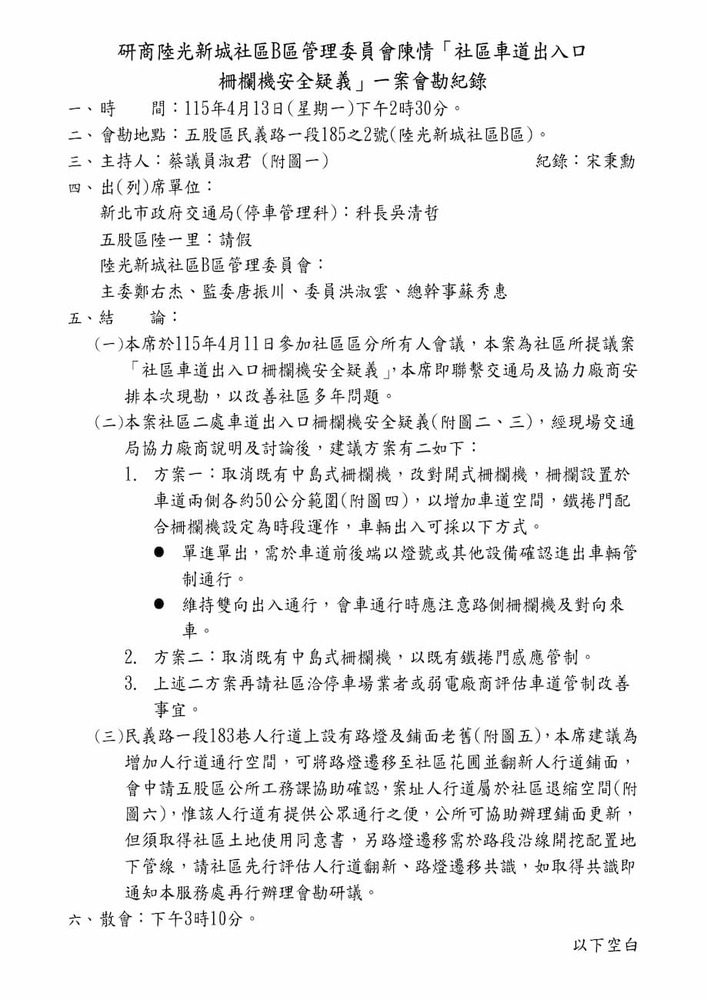 檢送研商陸光新城社區B區管理委員會陳情「社區車道出入口柵欄機安全疑義」一案會勘紀錄。(22955)